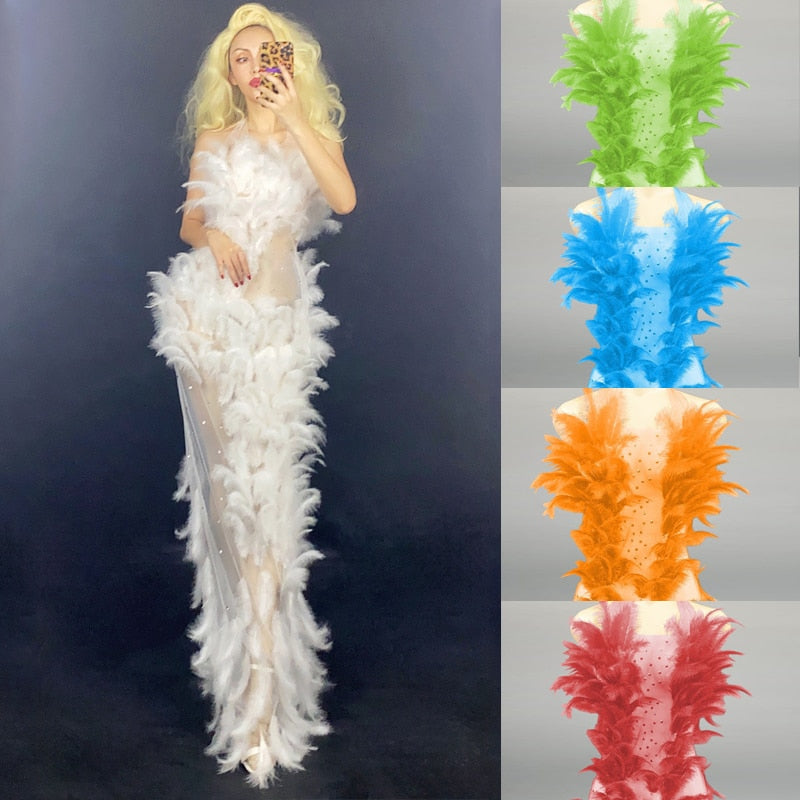 Birthday Party Long Dress See-Through Rhinestone Feather Dress Bandage Dress Singer Dancer DJ DS Rave...