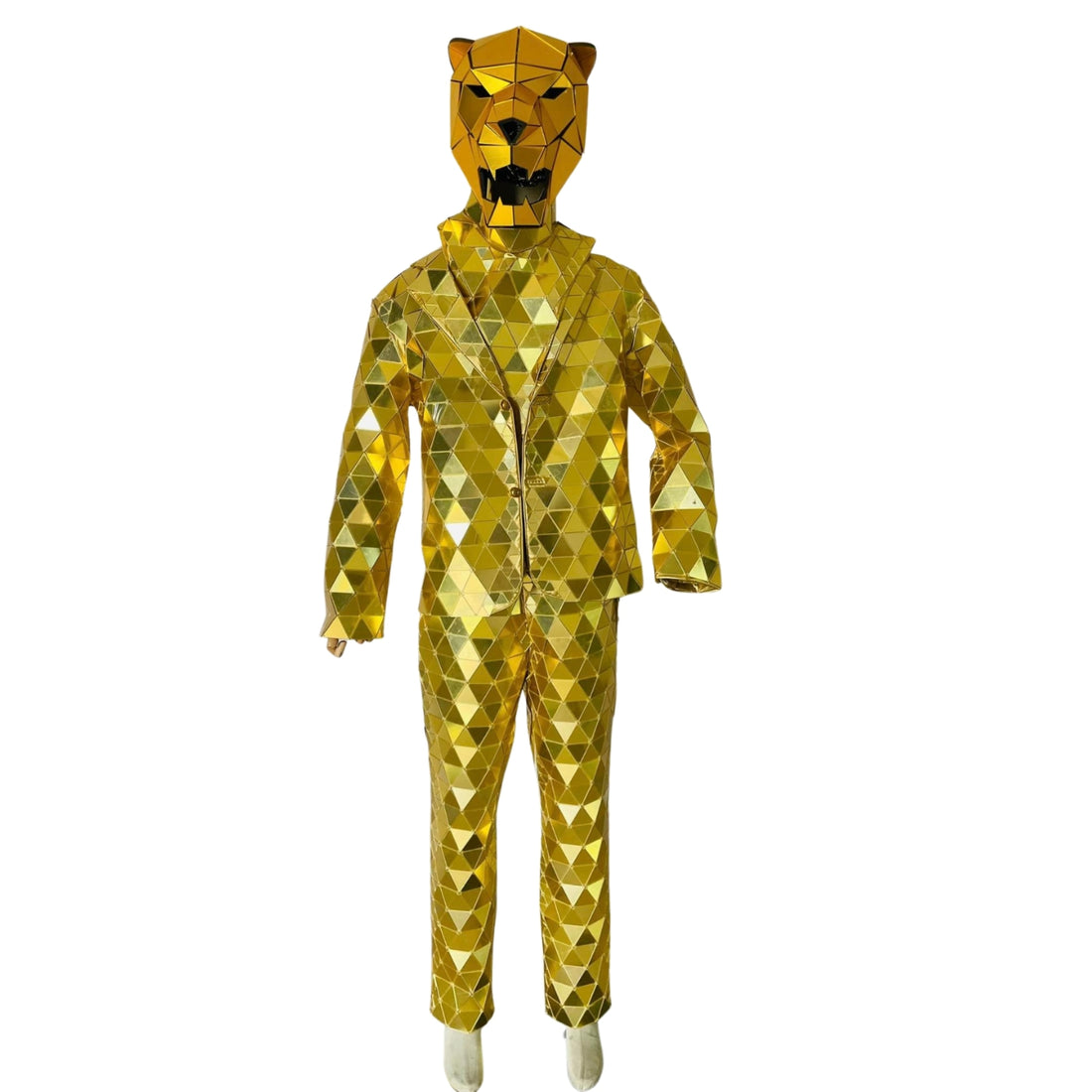 Gold Mirror Man with Lion Helmet for Disco Party DJ Adult Stage Street Costume