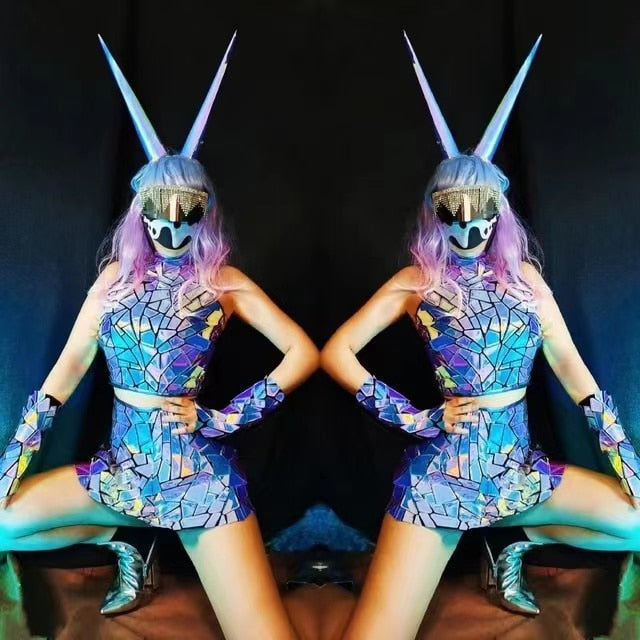 Woman Sexy Blue Mirror Dress Gogo Dance Performance Clubwear Party Copslay Fashion Costume