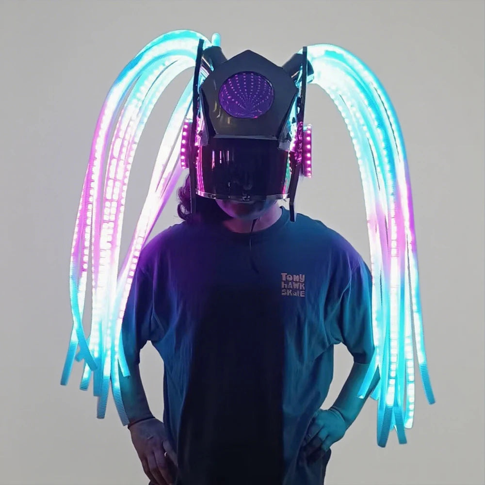 Unleash the Neon Futurist: Double Ponytail LED Robot Helmet Step into the future of performance...