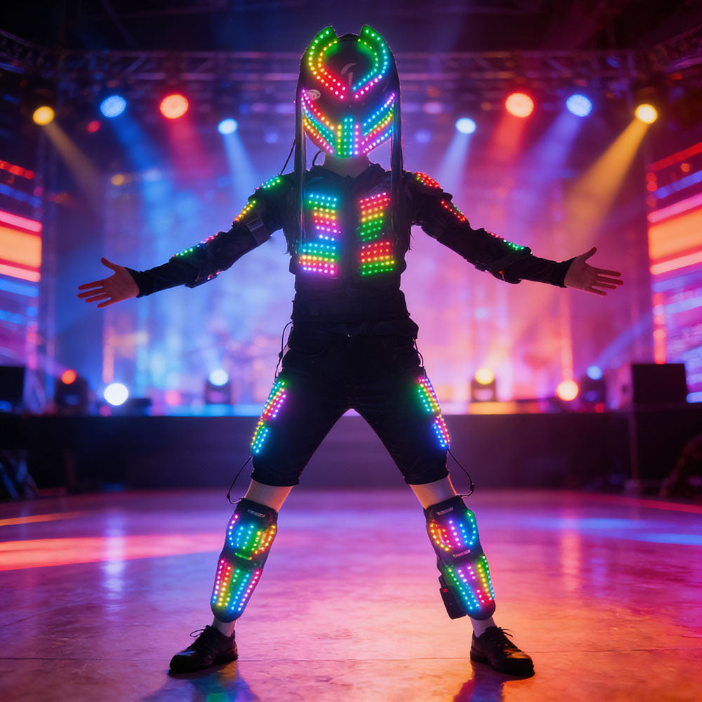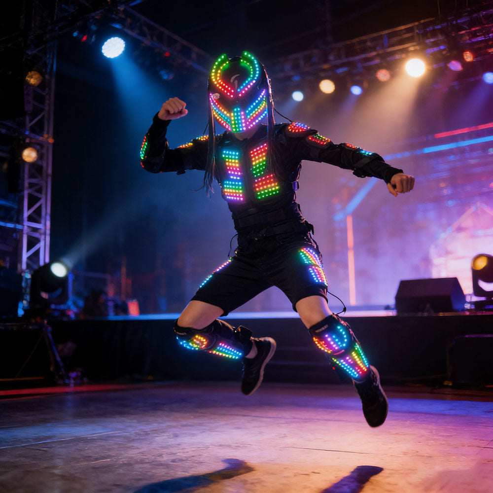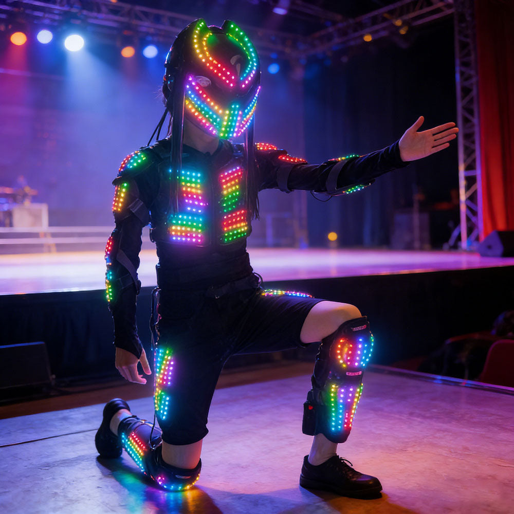 Command the dance floor and dominate every event with our Dynamic Light-Up Robot Suit. This complete set, featuring a synchronized flashing RGB jacket and a fierce Predator-style mask, is engineered to transform you into the most electrifying presence at any rave, prom, or cosplay convention. With easy remote control, you hold the power to control the light show and become the visual centerpiece of the night.
