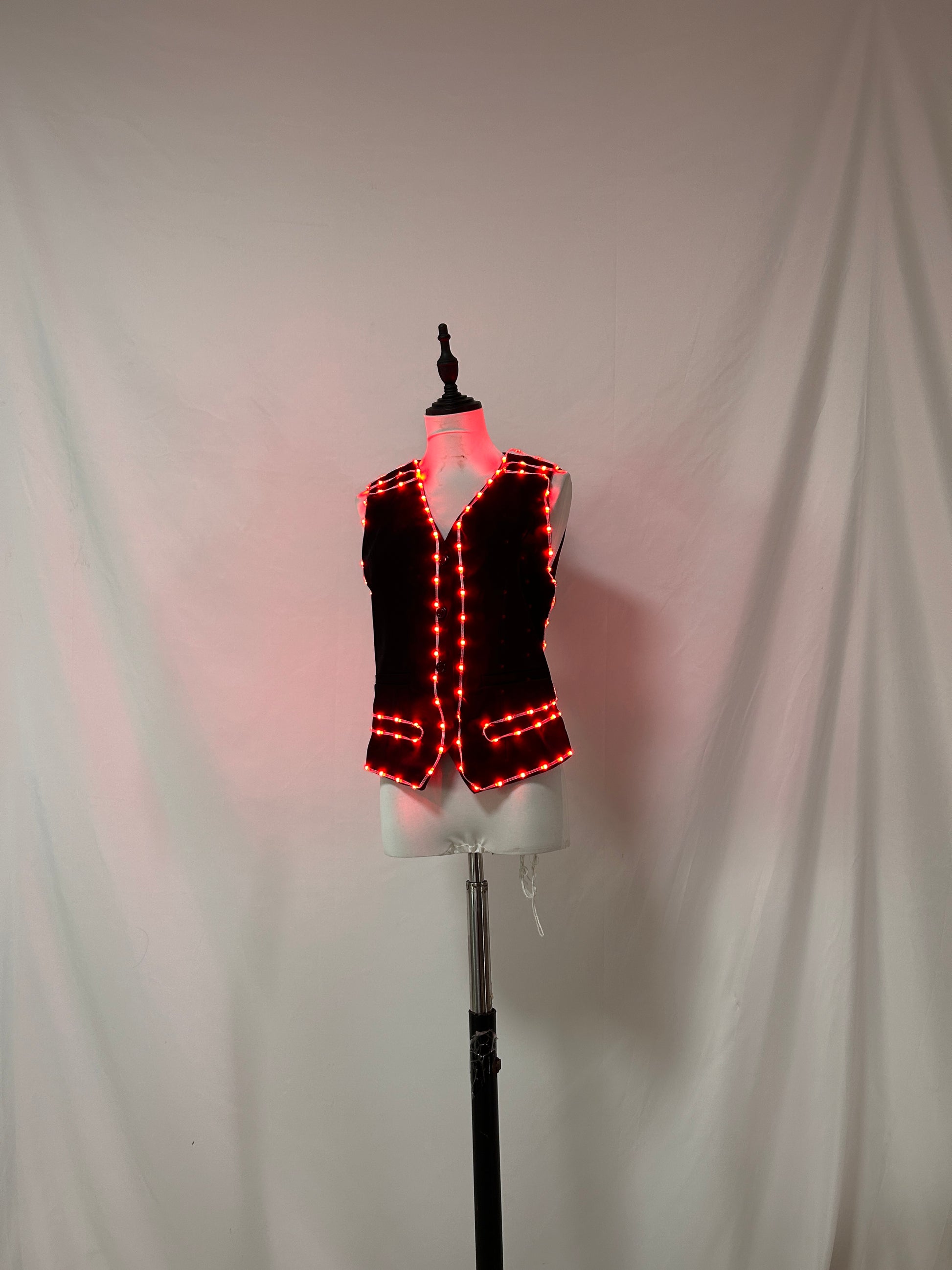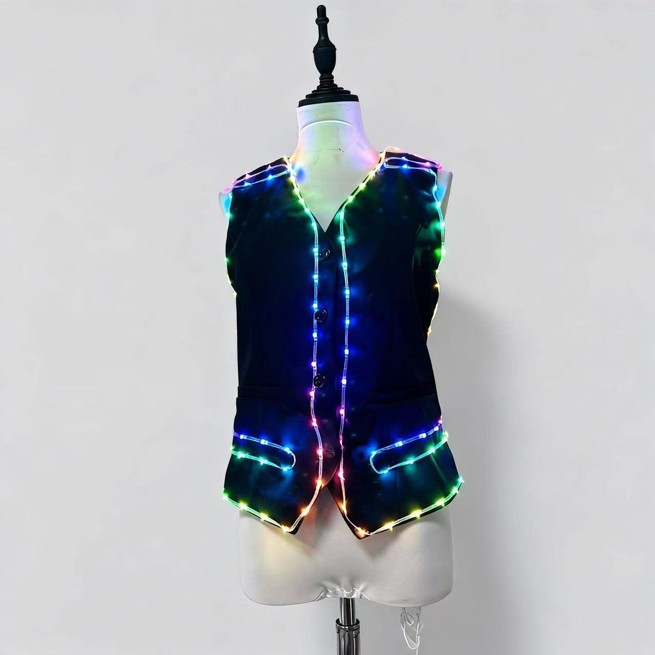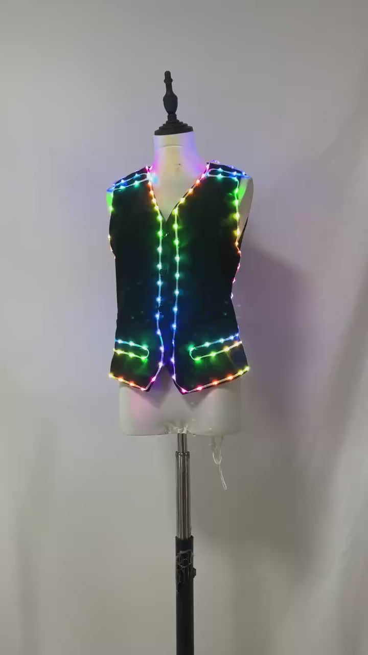 Light up the night with our LED Light-Up Black Sleeveless Vest, the ultimate glowing party outfit designed to make you the center of attention at any night event or festival. This vibrant vest combines a sleek black design with dynamic colorful LED lights that shine brilliantly in the dark. Whether you're dancing at a music festival, attending a night party, or celebrating at a special event, this vest ensures you stand out with its eye-catching glow and modern style.