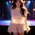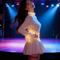 This LED-enhanced stand neck top with lantern sleeves and delicate ruffles blends contemporary fashion with subtle illumination technology. Designed for the modern woman seeking elegance with a technological edge, the minimalist solid color base is accentuated by integrated LED lighting, creating a versatile piece suitable for both daily wear and special occasions. The stand neckline, voluminous lantern sleeves, and tailored waist ruffles work together to flatter the silhouette with sophisticated charm.
