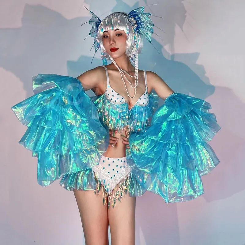 Dazzling Mermaid Show Costume - Full Sequin Bikini Ensemble with Glittering Flared Sleeves for Nightclub & Stage Performances