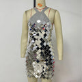 Women Gold Sexy Sleeveless Backless Evening Party Dresses Silver Square Disc Chainmail Halter Mini Dress