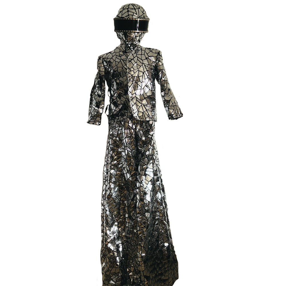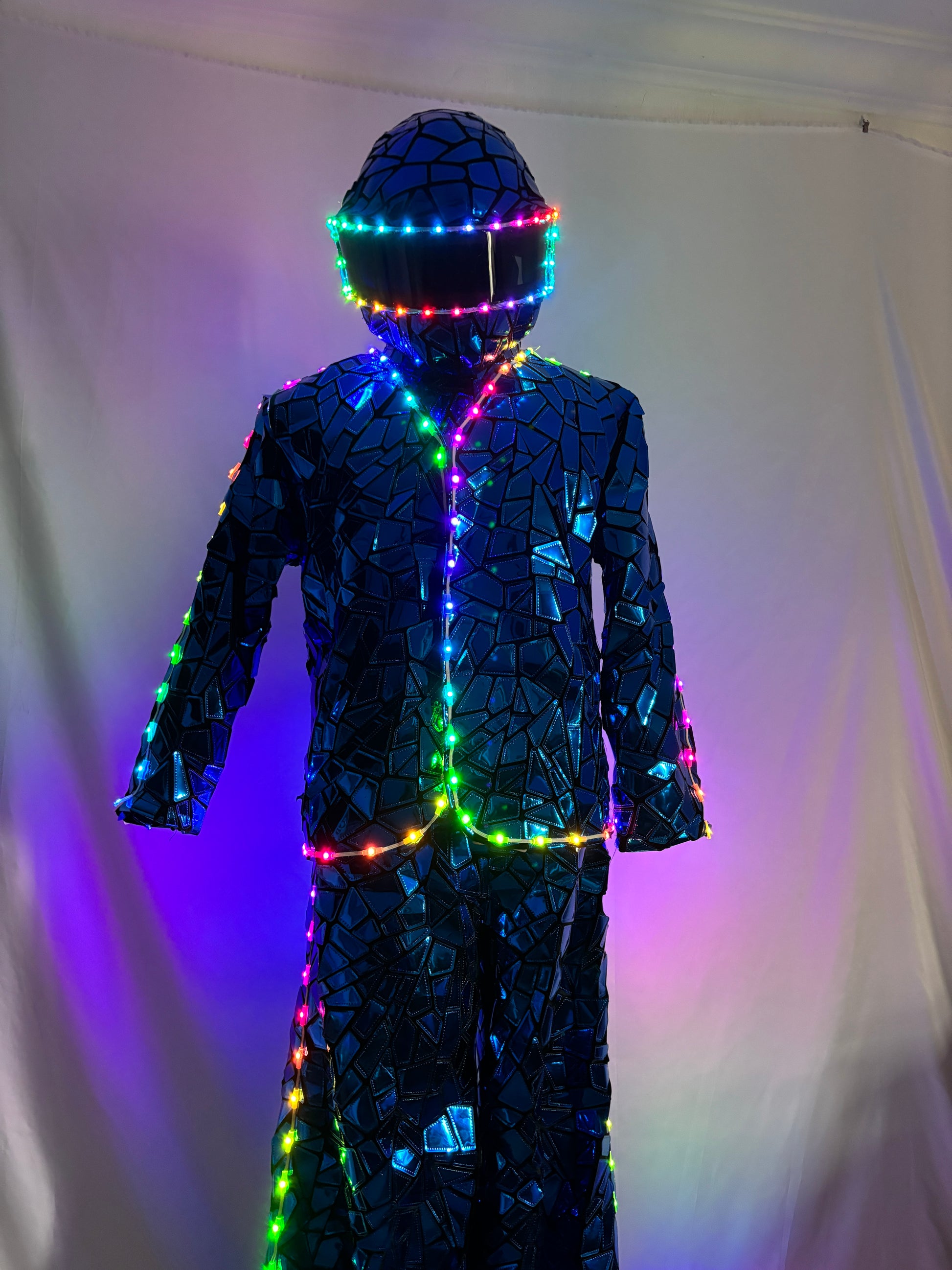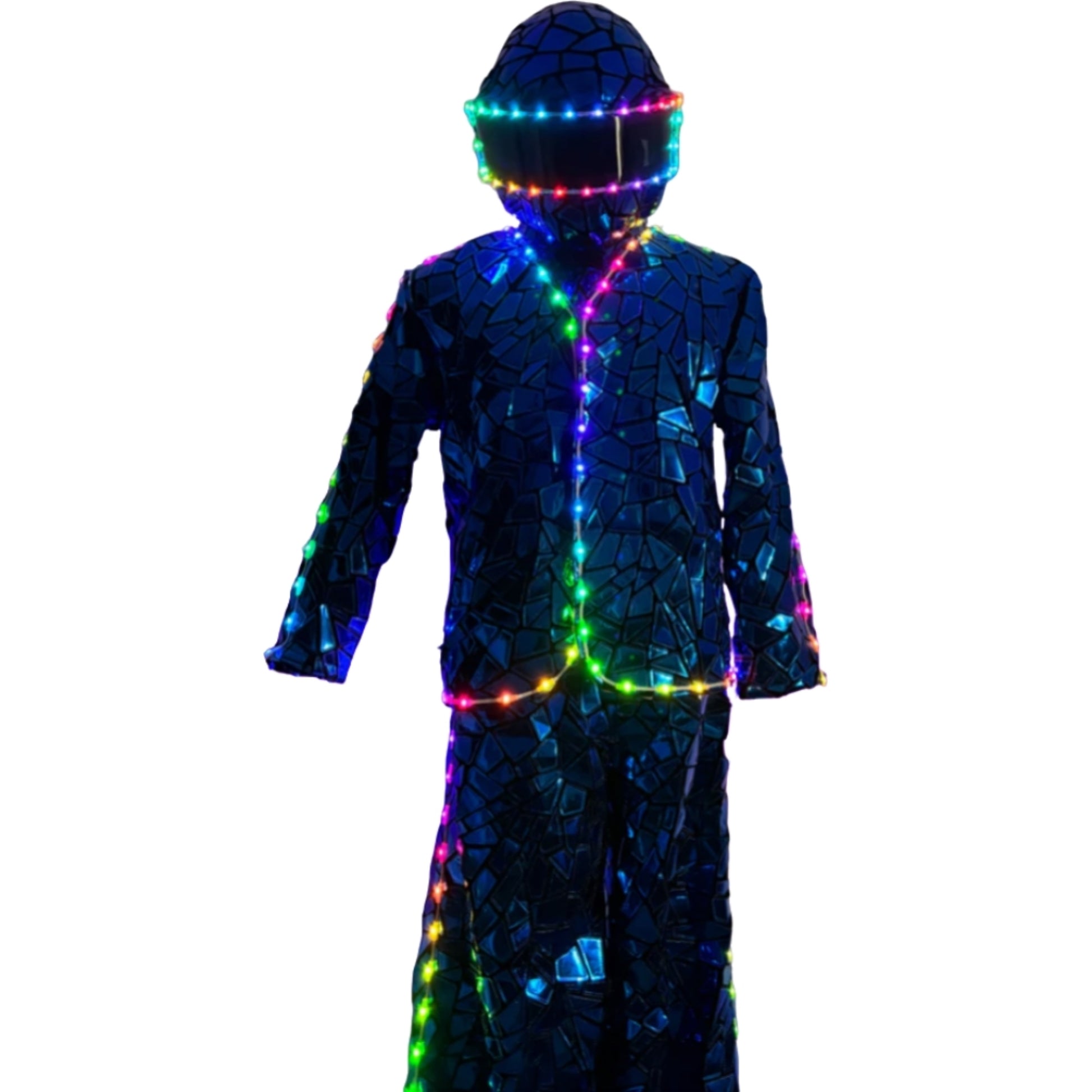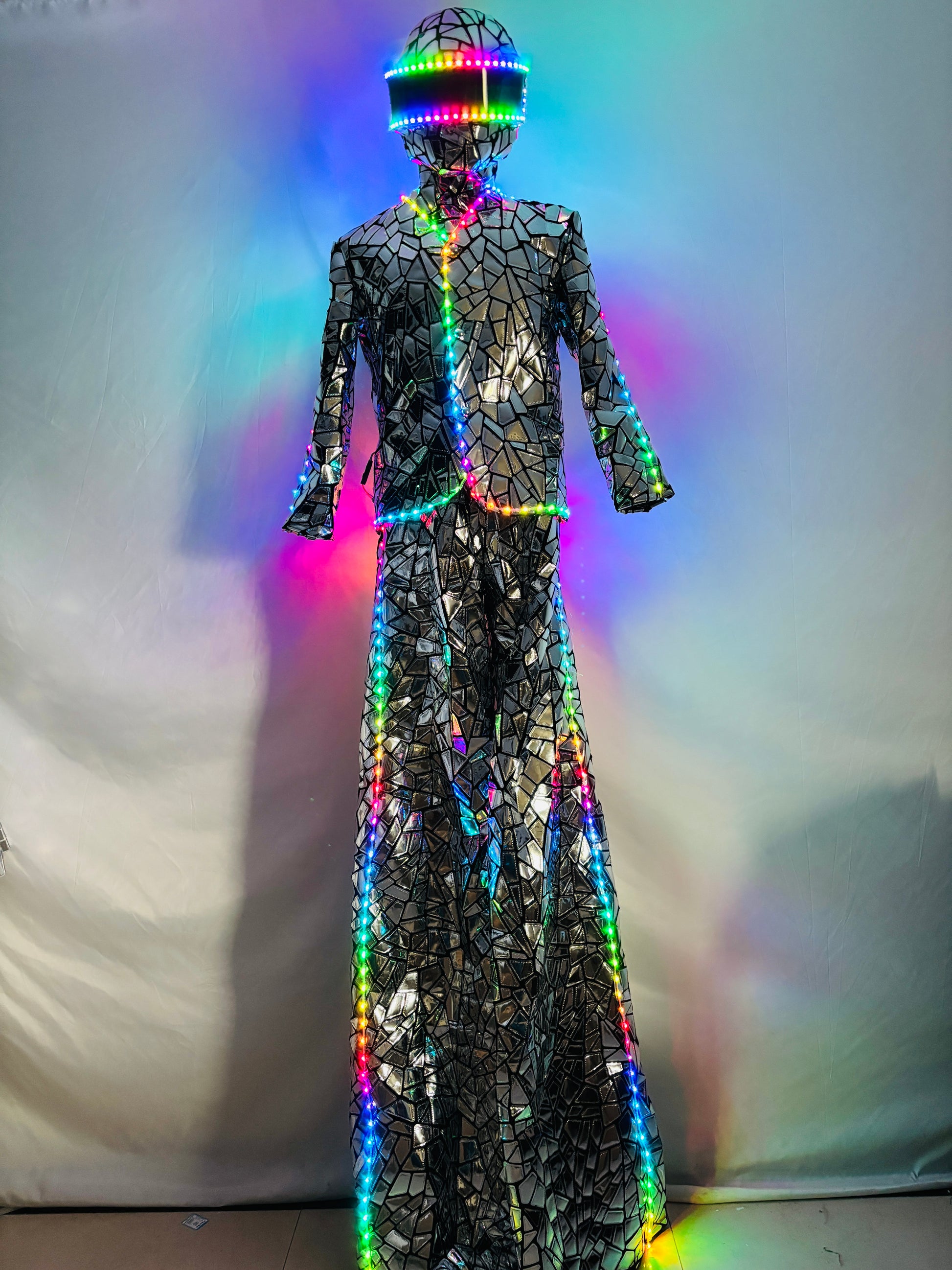 This costume is designed for the performer who values both style and convenience. Powered by AA batteries or a 5V power bank, it's easy to set up and use, allowing you to focus on your performance. The silver mirror clothing is available in standard sizes, but can also be customized to fit your unique body shape.