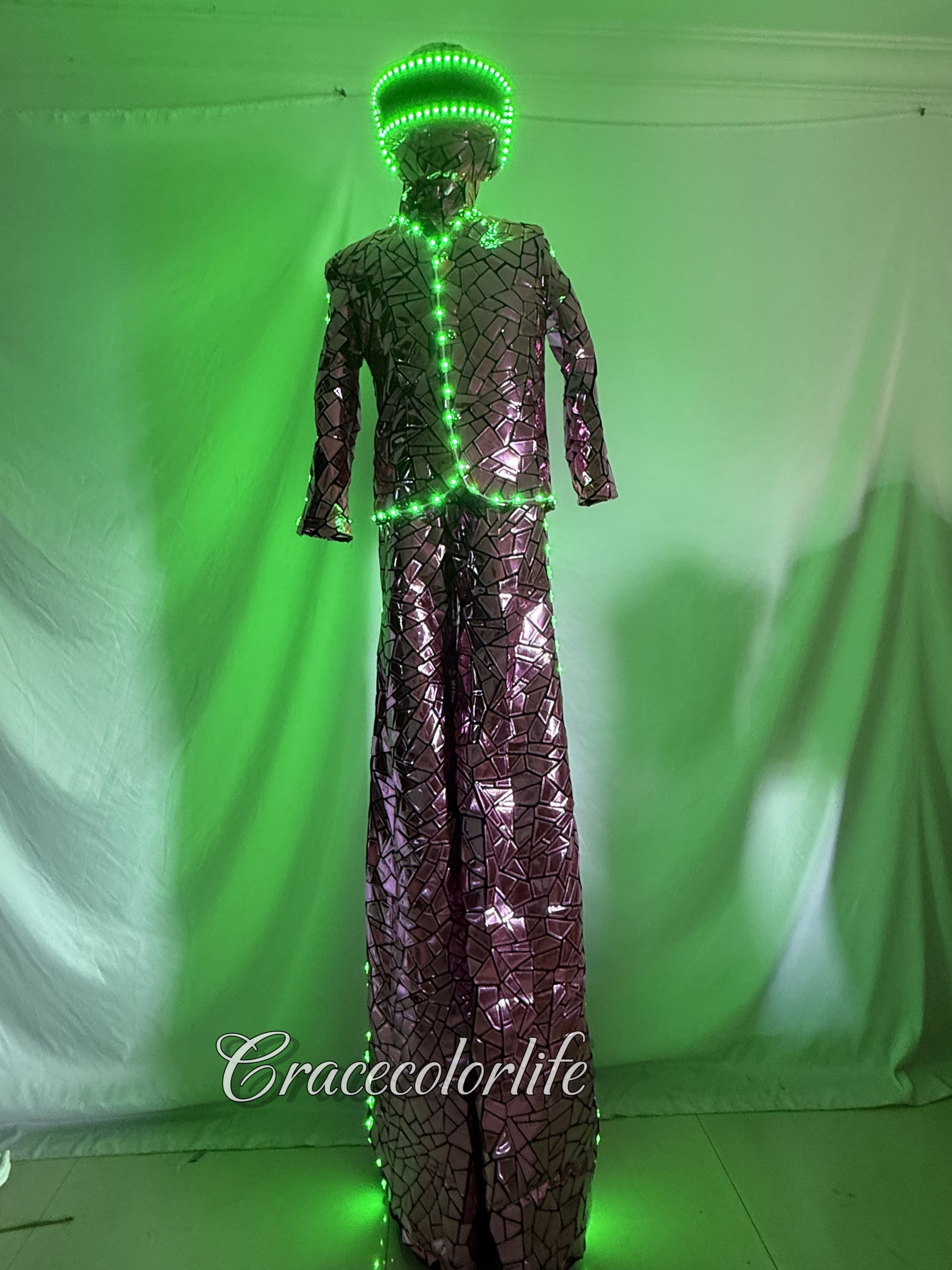 This costume is designed for the performer who values both style and convenience. Powered by AA batteries or a 5V power bank, it's easy to set up and use, allowing you to focus on your performance. The silver mirror clothing is available in standard sizes, but can also be customized to fit your unique body shape.