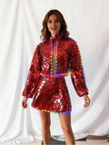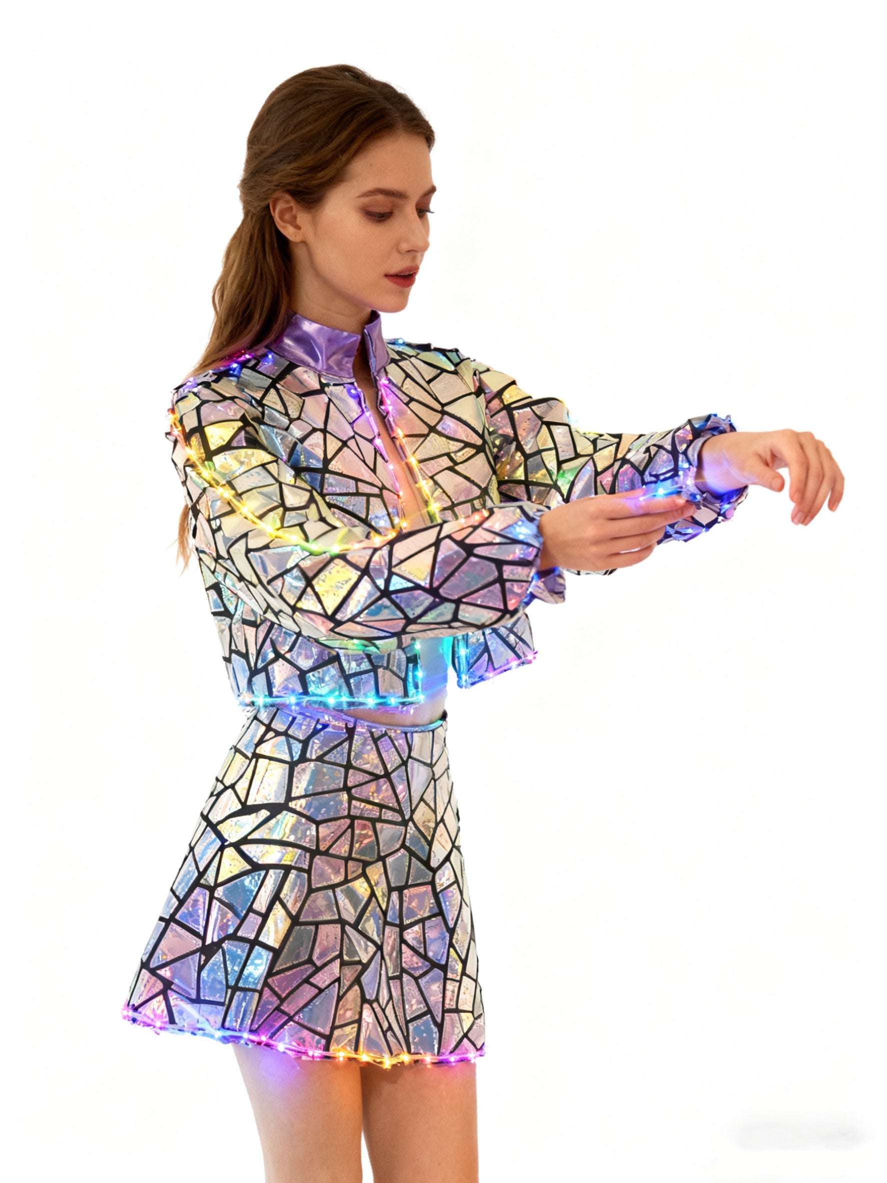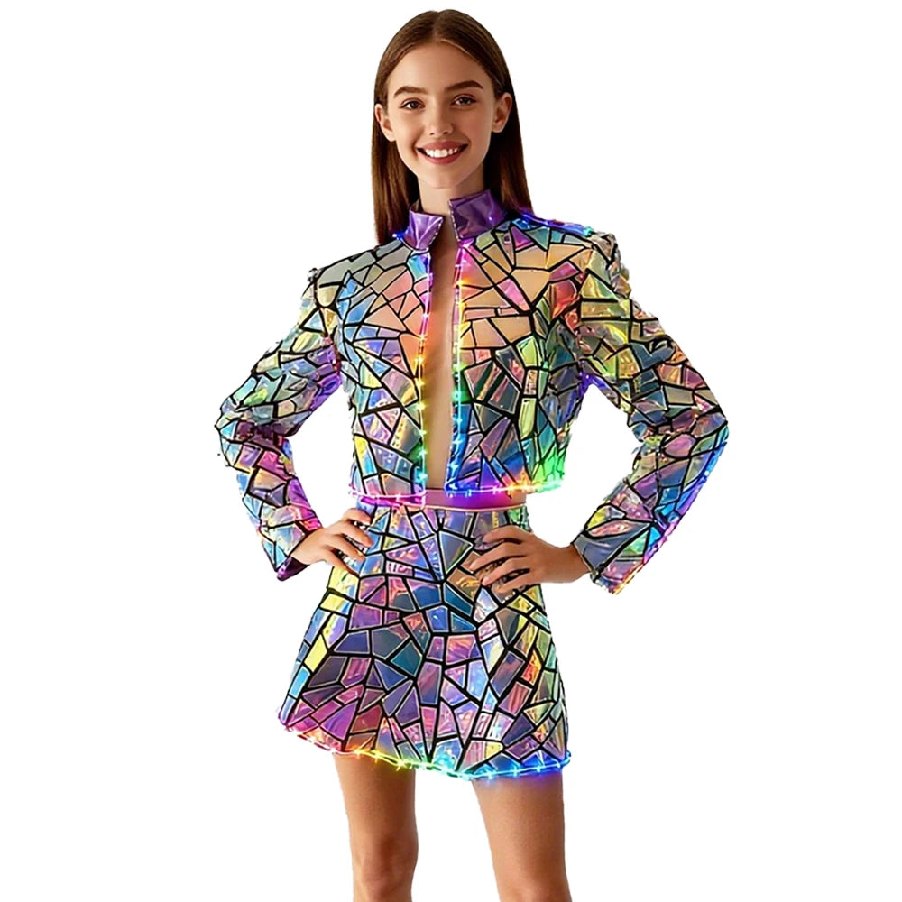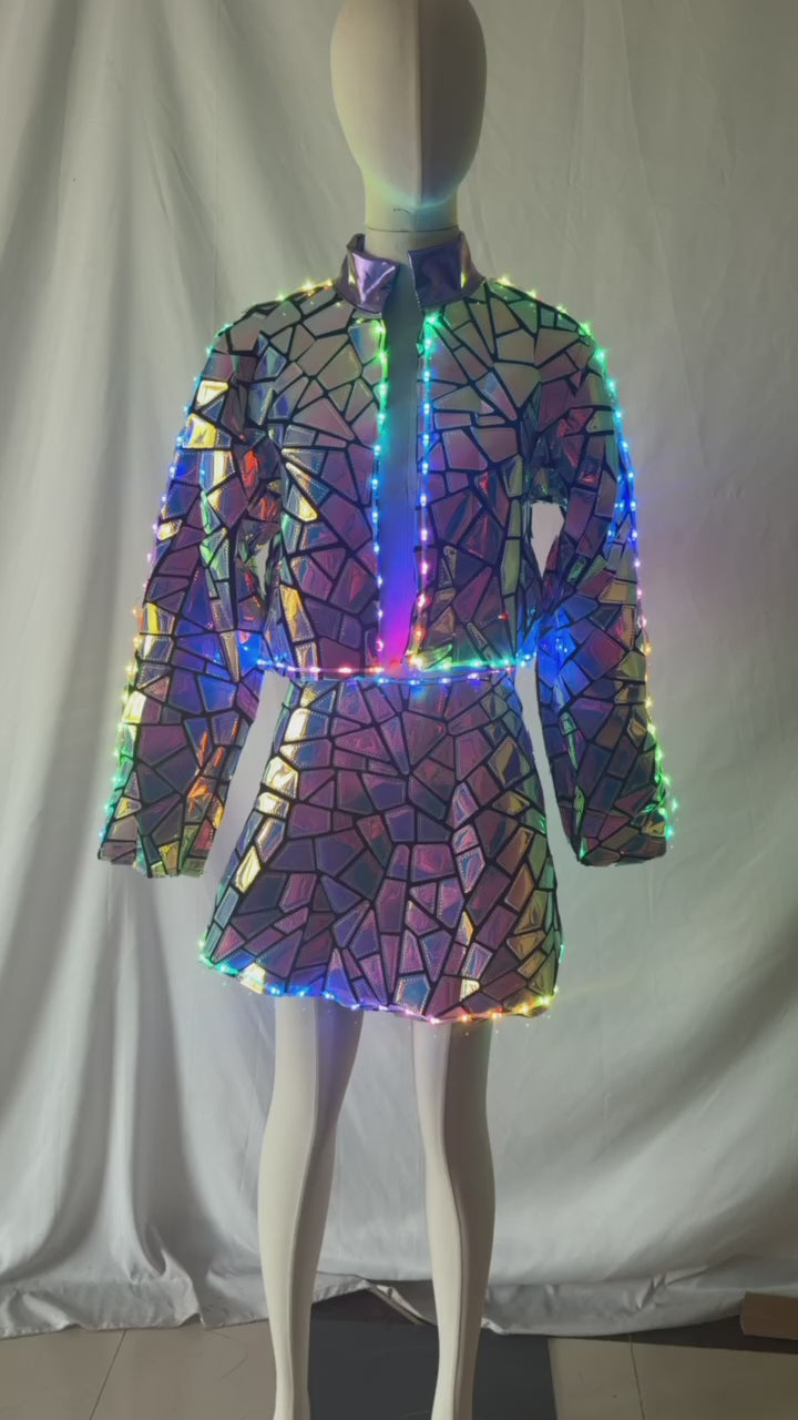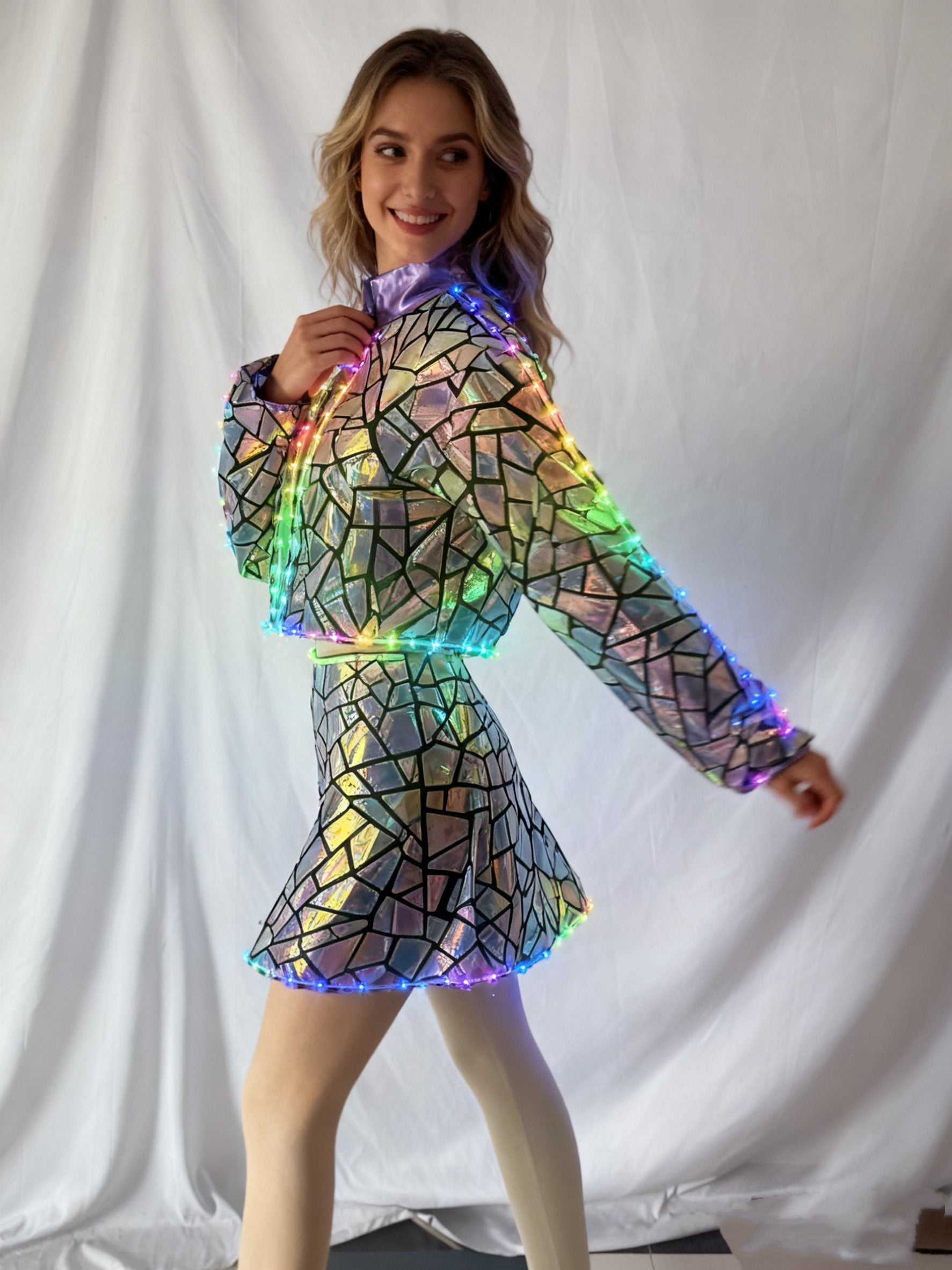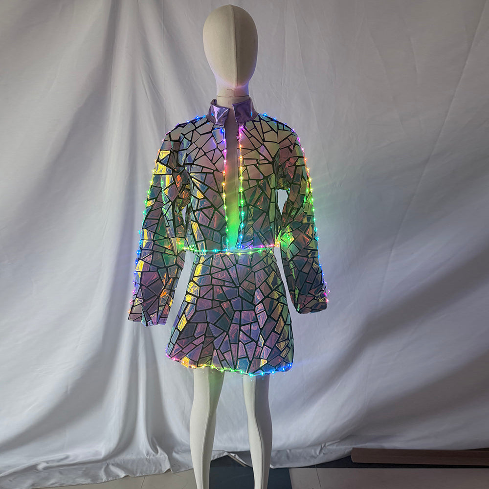 Step into the spotlight with the Silver Mirage Metallic Performance Suit, a complete ensemble designed for bold visual impact. This LED reflective mirror dress and pants set transforms you into a walking prism of light, combining futuristic metallic fabric with full-body coverage for a truly mesmerizing club, party, or cosplay appearance.
