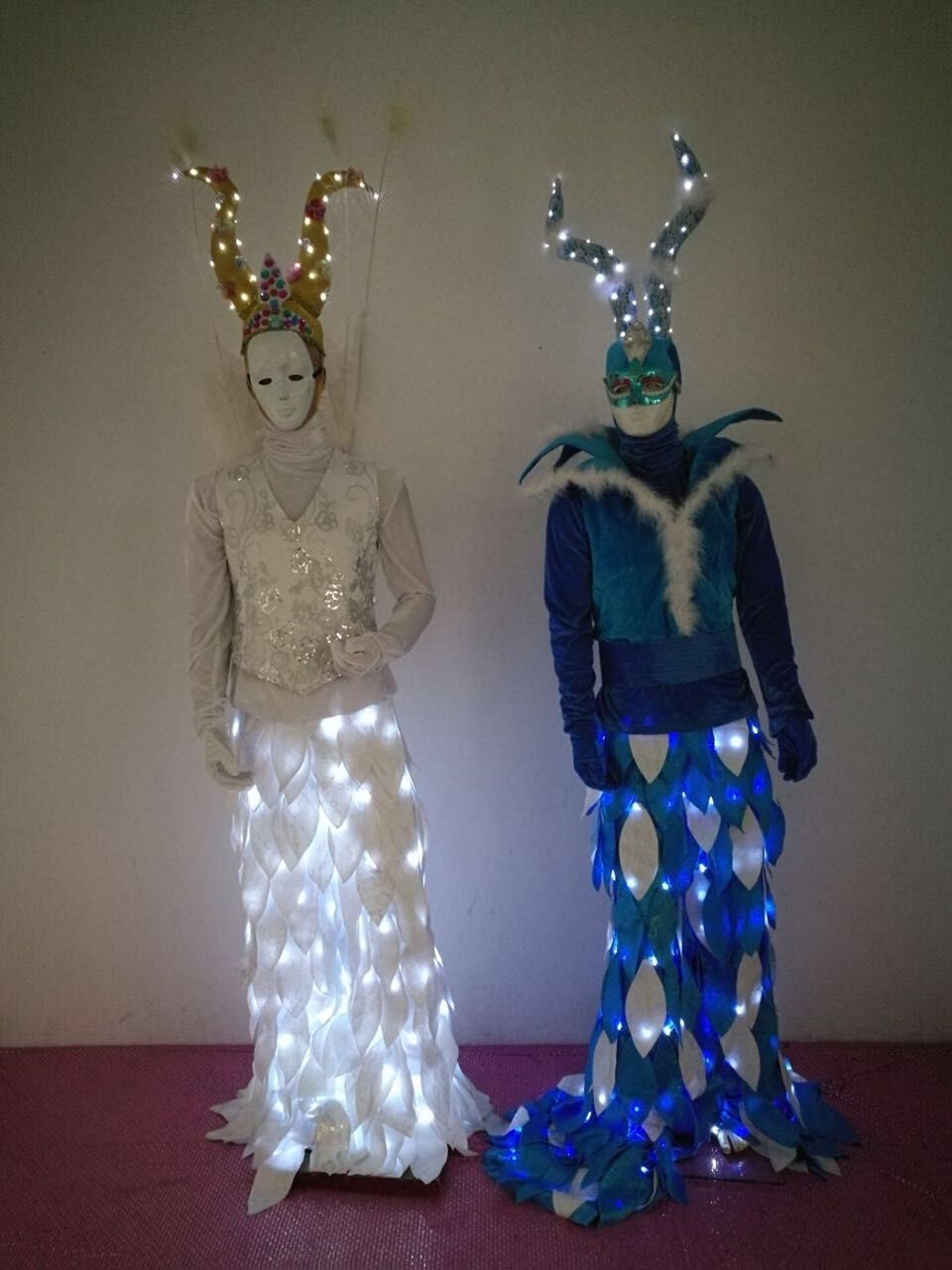 2) it is for stilts walker. white LED with white / Blue fabric. if you need other color, please message us.