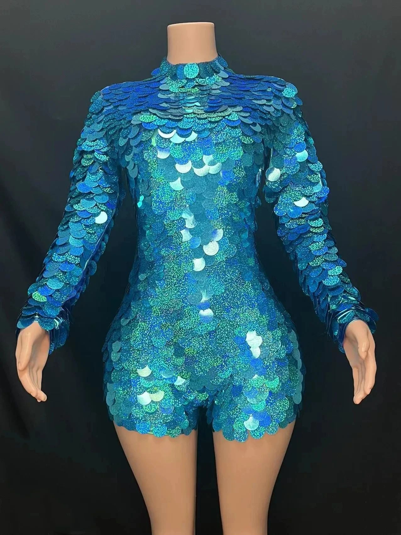 Command the stage in this breathtaking blue laser sequin bodysuit, designed for dancers who demand both high-impact style and unrestricted movement. Its long sleeves and full-coverage design create a sleek silhouette that catches and reflects light with every move,making you the undisputed focal point of any competition or performance.