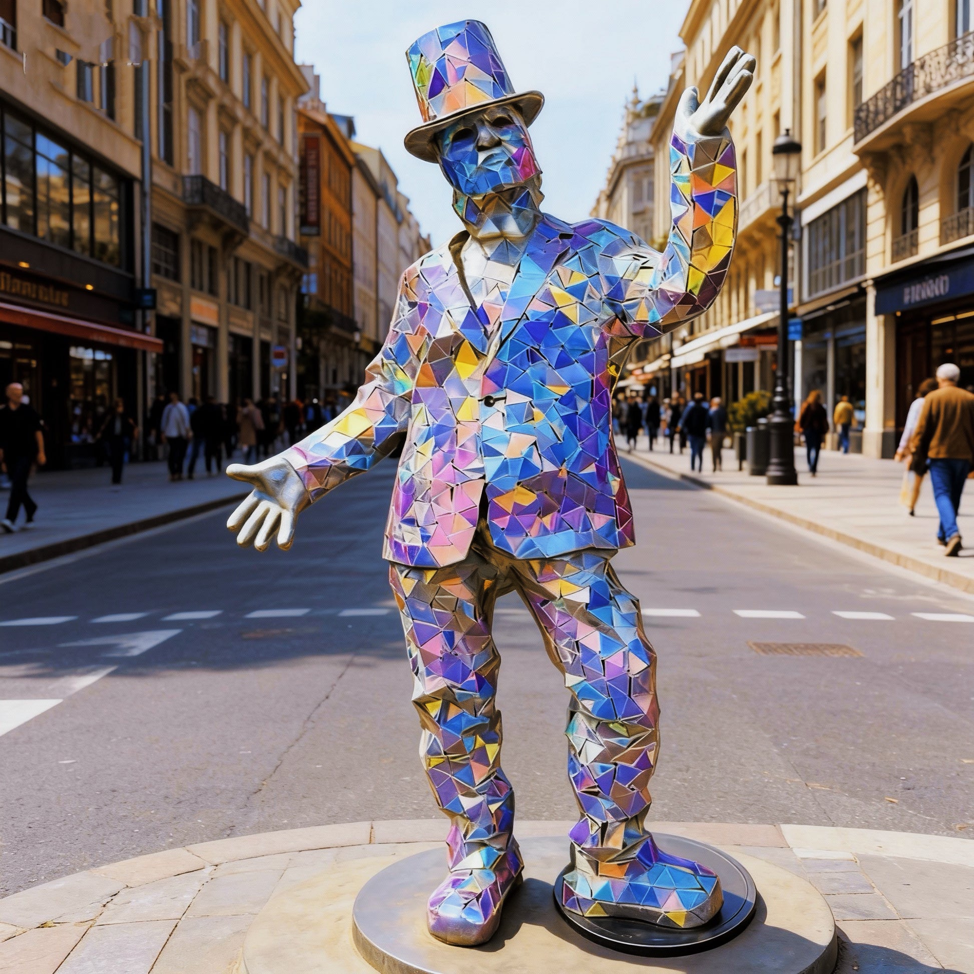 Unveil the magic of light and geometry with the Mirror-Fragment Top Hat Costume—an iridescent mosaic masterpiece designed to captivate at every event. Featuring a striking top hat and matching suit adorned with precisely cut geometric mirror fragments, this outfit reflects and refracts light into a dazzling spectrum of colors. Perfect for cosplay, stage performances, themed parties, and artistic events, it blends avant-garde style with wearable art, ensuring you become a living, shimmering centerpiece.