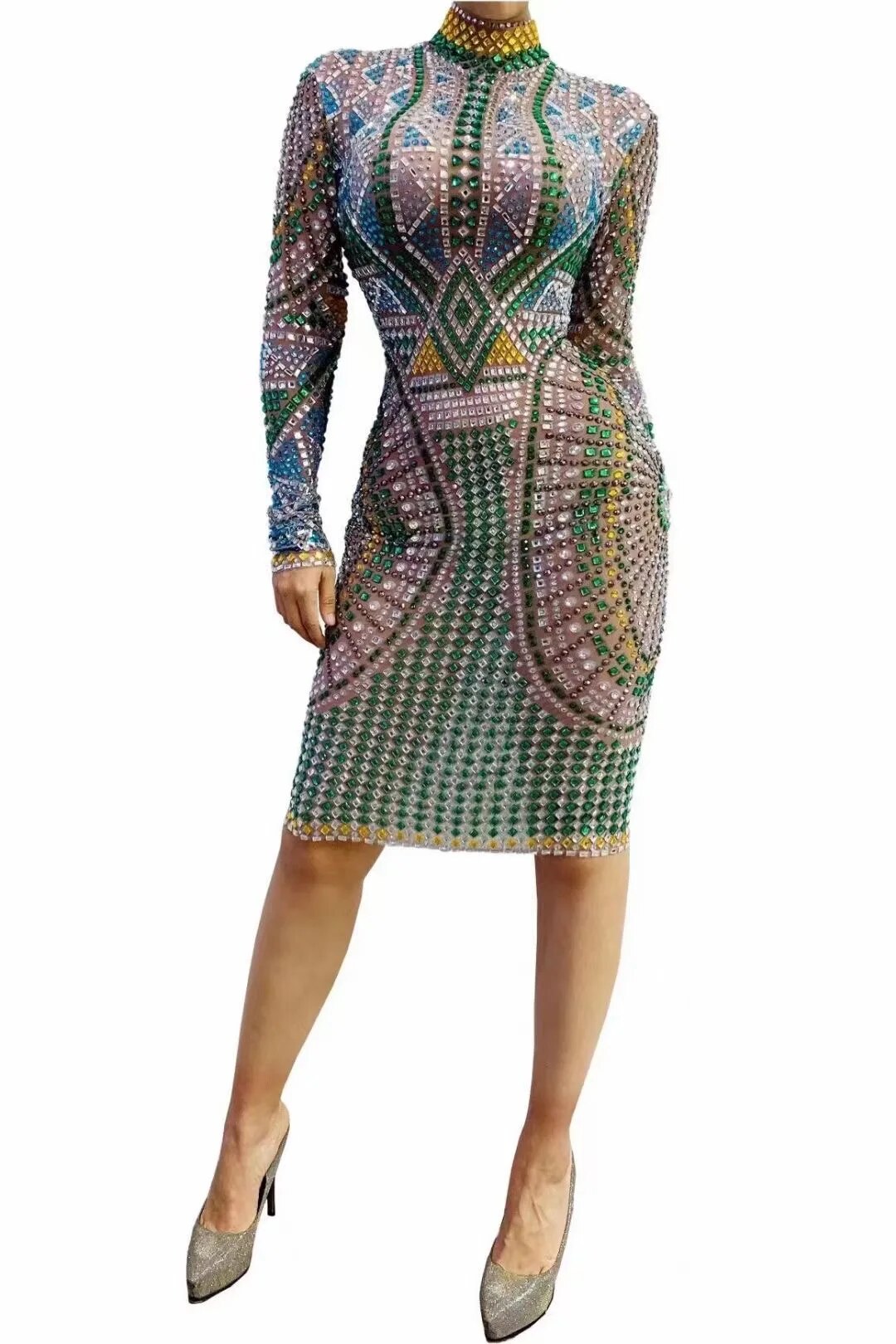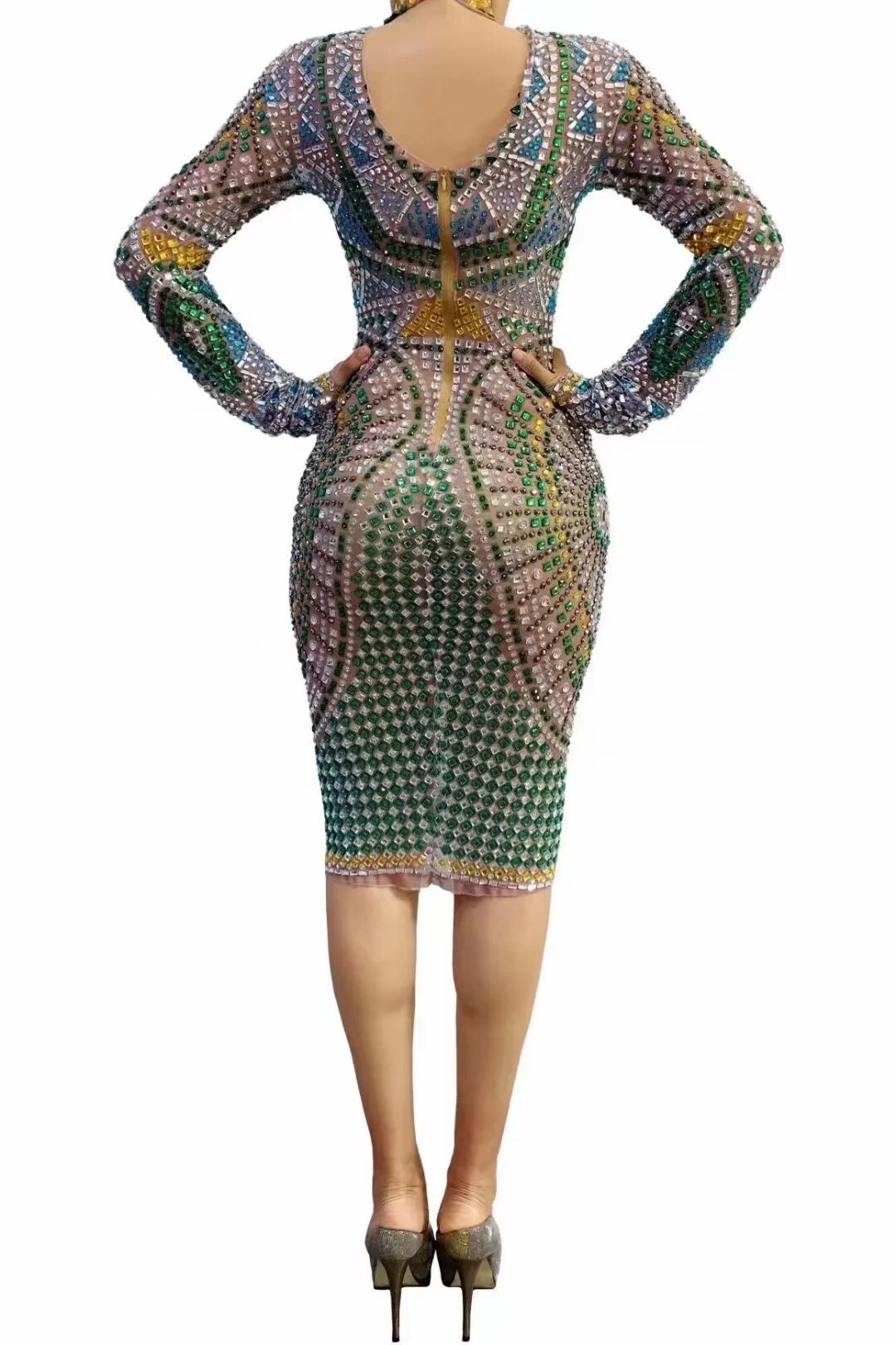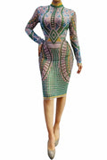 Women's Stretch Slim Rhinestone Performance Costumes Long Sleeve Elastic Dress Festival Celebration Suits Party Show Skirts